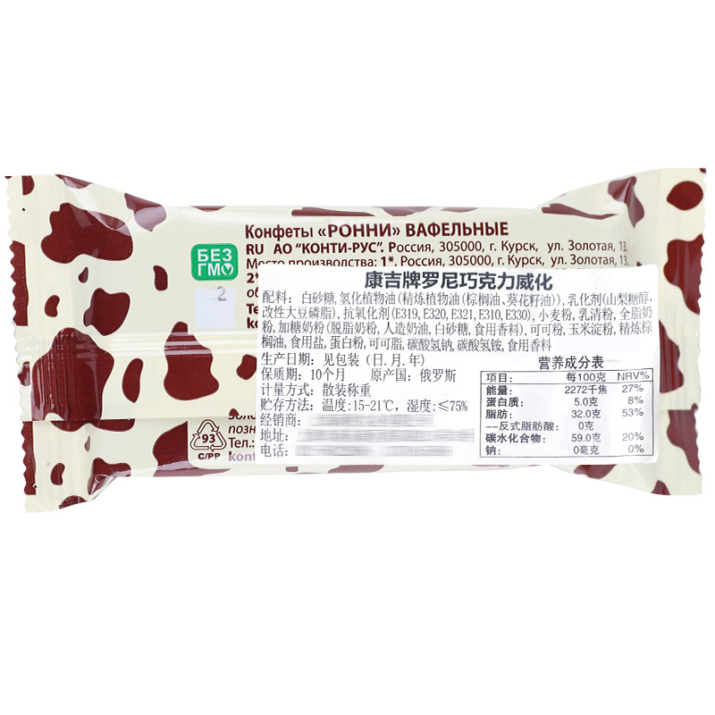 商品名称:俄罗斯进口零食品 POHHN小牛大奶牛巧克力威化夹心饼干15包约500g 500g/袋 约15包